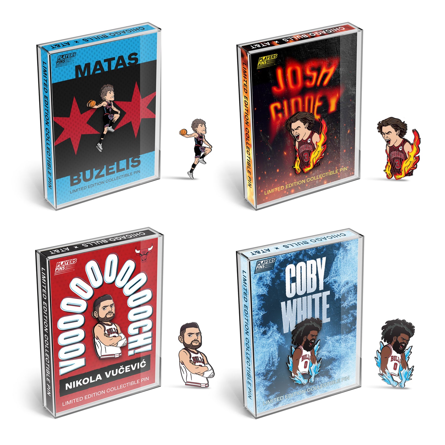 Limited-Edition Collectible Players Pins featuring Matas Buzelis, Josh Giddy, Nikola Vucevic & Coby White